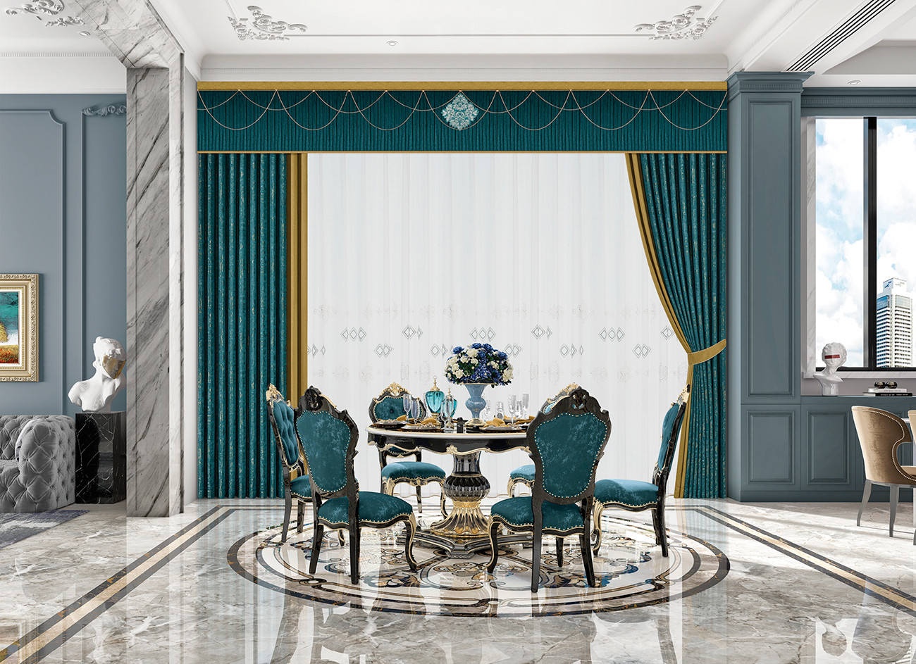 靈感源自歐洲的古典紋樣,展現溫暖奢華的奇妙視感。在柔軟的肌理表面增加流動曲線,搭配華貴祖母綠,呈現一種古典與簡約的折中主義。
