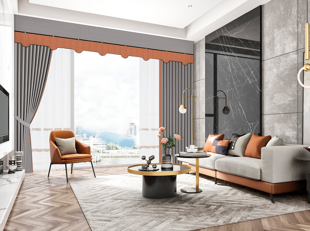 雅致的灰色調勢帶來精致感,一抹張揚的橘調流動其中,深淺遞進的層層伏筆,傳遞審美與情緒,明快而富有張力的色彩搭配,加深了空間的立體性和層次感,時尚簡約的空間風格氣質非凡,再現文化基因里風雅與曼妙的生活。