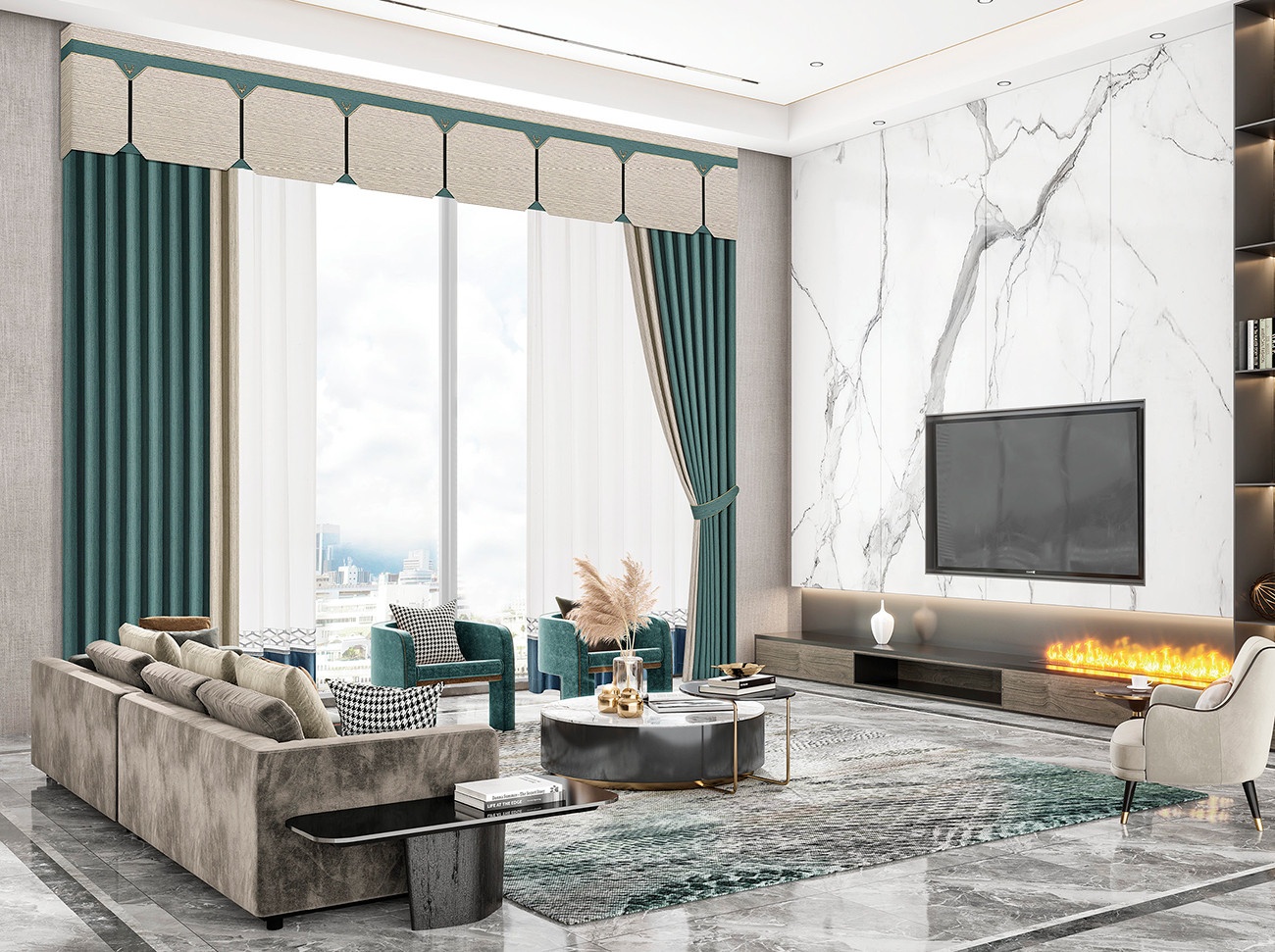 低調純凈的藍綠色如同靜待時光召喚的夢境叢林,與米灰色流暢自然的過渡渲染出時尚而清新的視覺享受。簡約而優美的方形依次排列,強勢而規律的美感折射著內涵豐富的動人魅力,精致的金色鹿頭裝飾,讓貴族氣質彰顯無疑。
